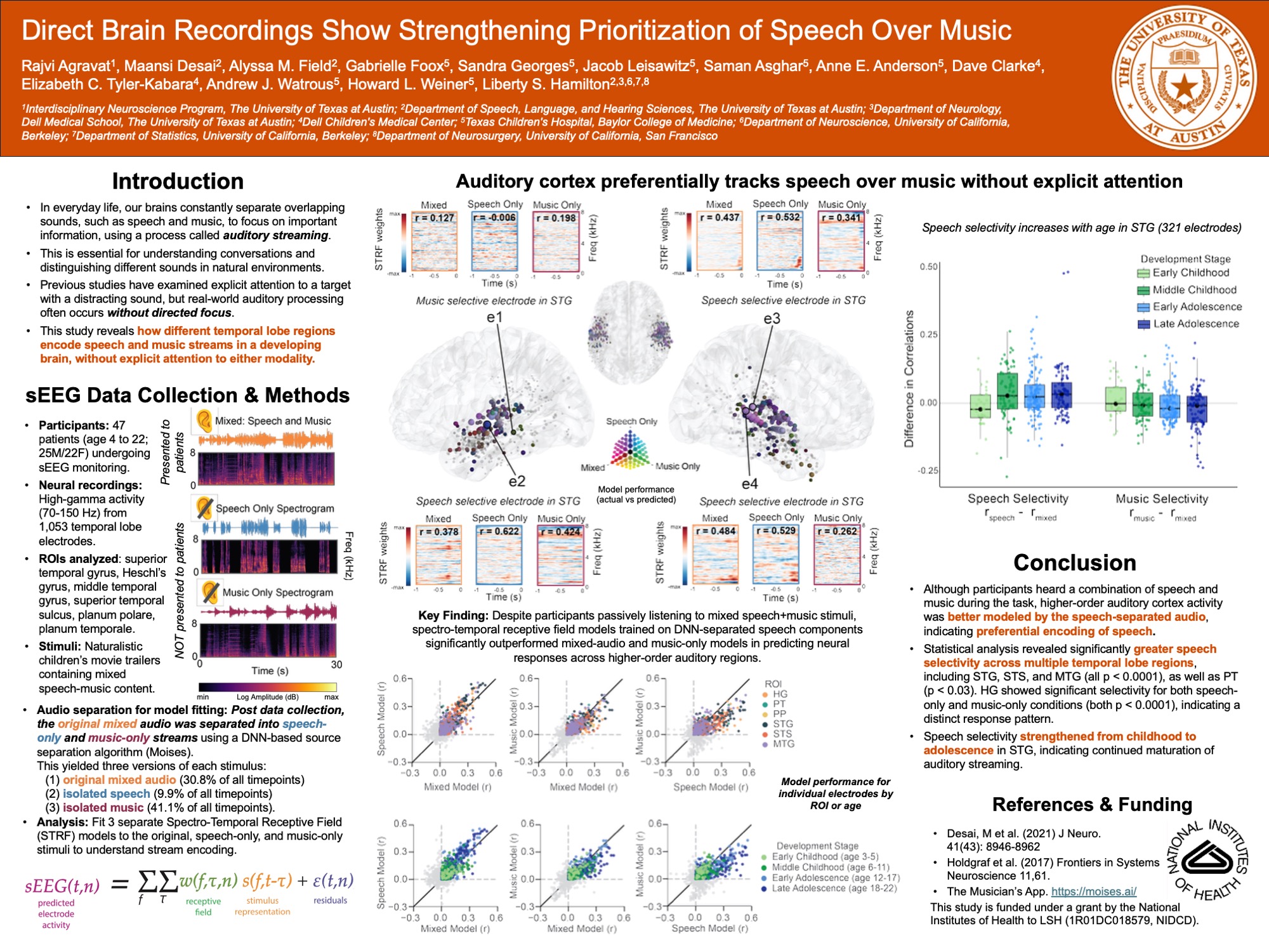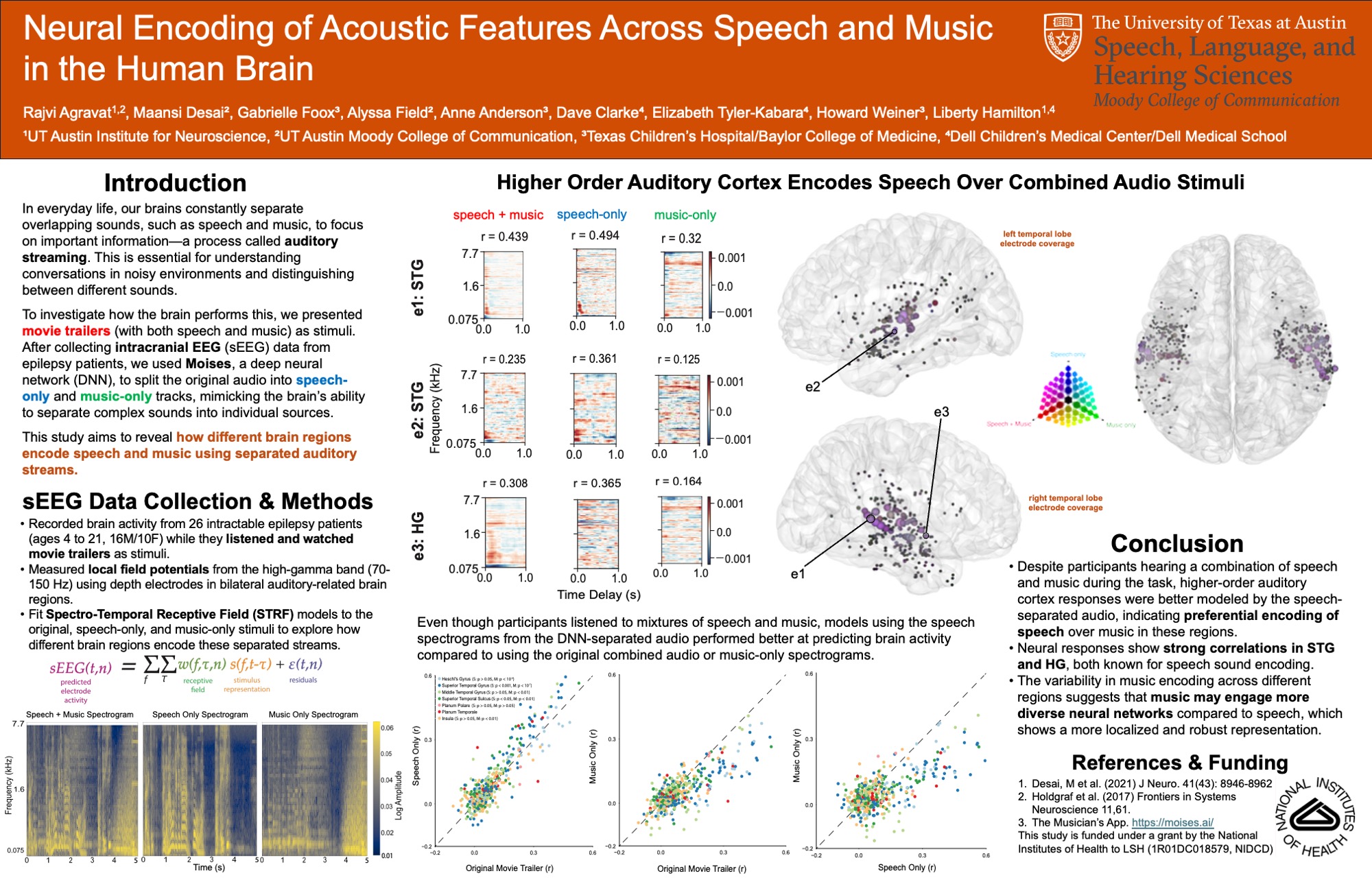 - R. Agravat, M. Desai, G. Foox, A. Field, A. Anderson, D. Clarke, E. T. Kabara, H. Weiner, L. Hamilton. Neural Encoding of Acoustic Features Across Speech and Music in the Human Brain.[Poster]
